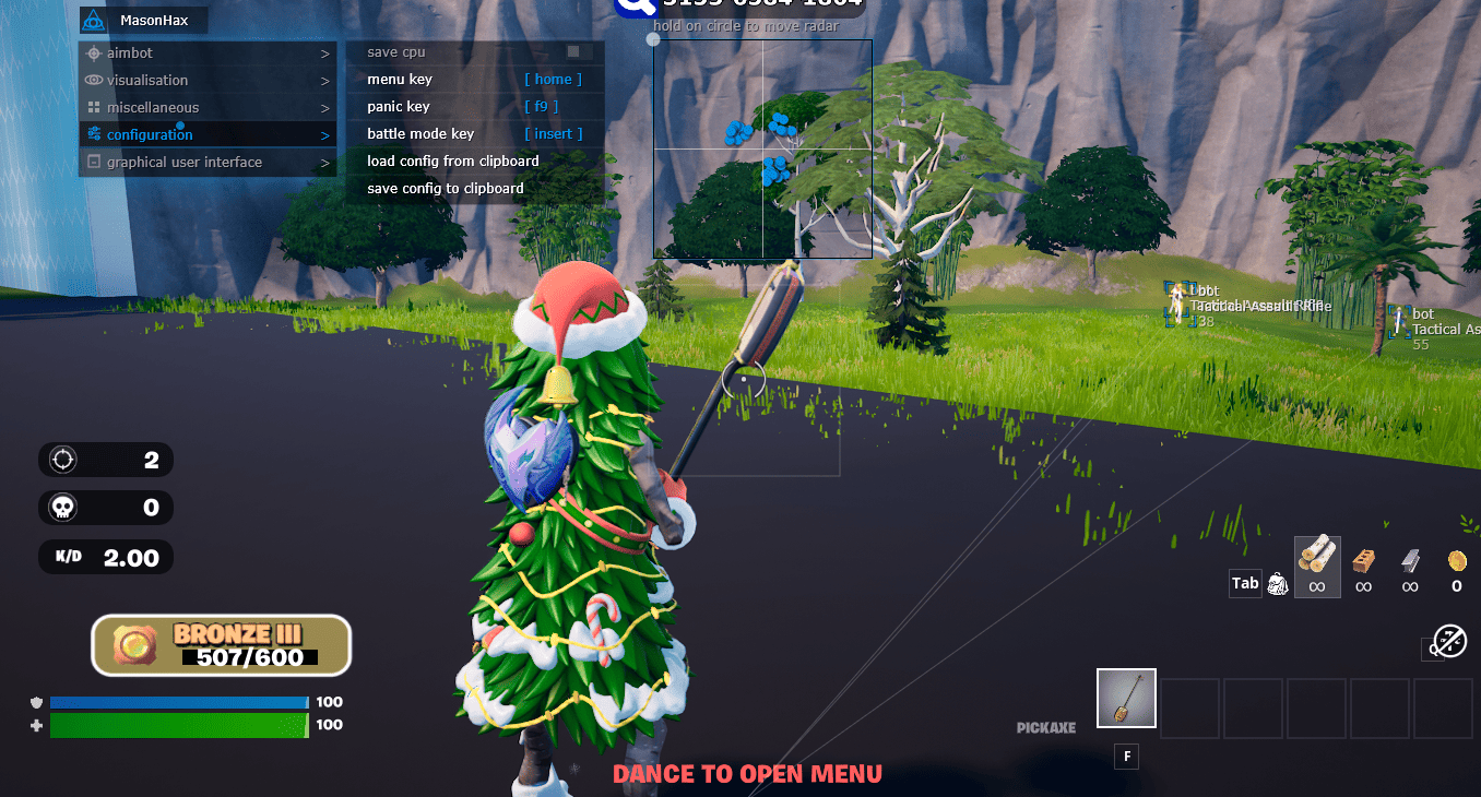 Mason (Masonhax) для Fortnite — минималистичный чит с компактным меню. Аимбот (предикт, авто-переключение, кости, FOV, smooth), ESP (ник, оружие, дистанция, скелет, бокс, snapline, перезарядка), радар 2D. Instant reload/revive, Stream-Proof, Panic Key, конфиги через буфер. Поддержка невидимости на видео или скриншотах: Да Загрузочный режим BIOS: UEFI, проверить какой формат используется в системе можно по инструкции ЗДЕСЬ Дополнительные требования к системе Windows: Включить VT-x / VT-d (Виртуализация) / Включить Hyper-V / Отключить Secure Boot Требуется USB флеш накопитель: Да