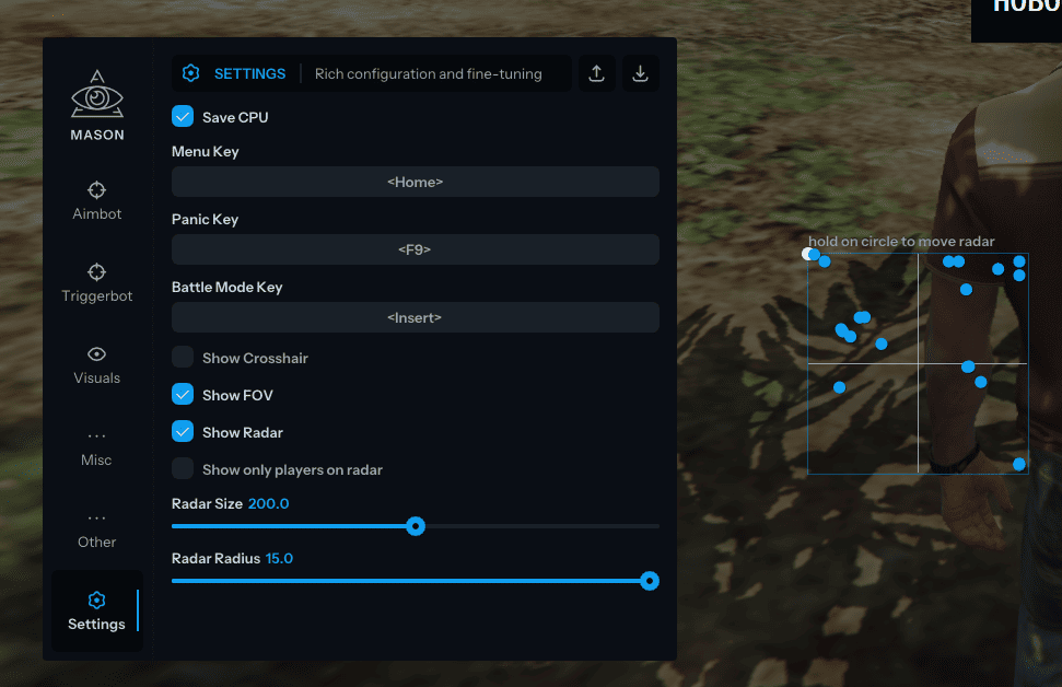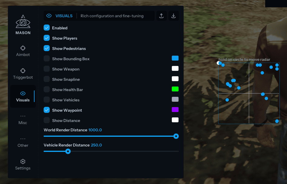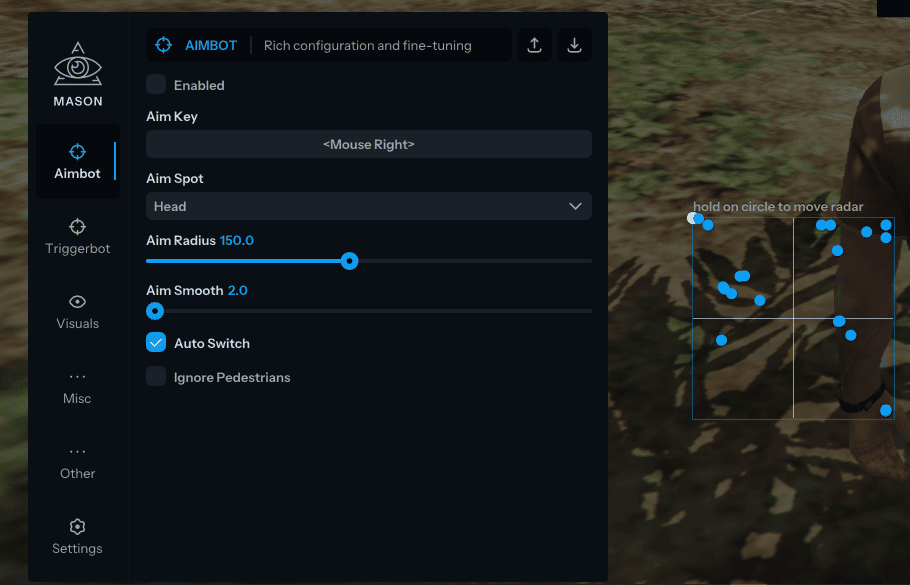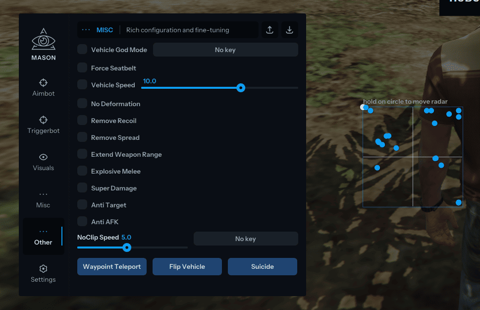 Mason для GTA 5 RP — мощный приватный чит. Aimbot с плавным наведением, триггербот с задержкой, ESP для игроков/ботов/транспорта/HP/дистанции. God Mode, NoClip, телепорт, суперпрыжки, взрывные удары. Транспорт: ускорение, переворот, ремень. Радар, прицел, анти-фриз админов. Стабильная работа.