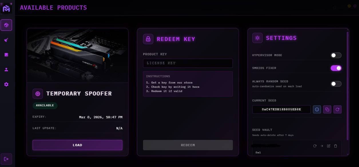 Temp Spoofer - Новый продукт! Забанен по HWID в EAC/BattlEye/ACE/RICOCHET? Забудьте о переустановке Windows и BIOS. Временный спуфер маскирует железо на лету - чистый ПК, без следов. Ключевые фичи:   Без переустановки Windows. Без прошивки BIOS/UEFI — безопасно для всех. Максимум мощности. Минимум усилий. Запуск в один клик Продвинутый seed-based спуфинг для топ-обхода. Полный спуфинг диска и ARP. Маскировка GPU hardware ID. Авто-спуфинг EFI для глубокого обхода античита. Лёгкий и оптимизированный - без дропа FPS. Максимум мощности. Минимум усилий.